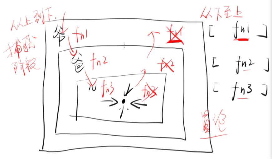 若三个 div 节点监听的事件均在捕获阶段,那么对应函数执行的顺序就是 fn1 > fn2 > fn3;
