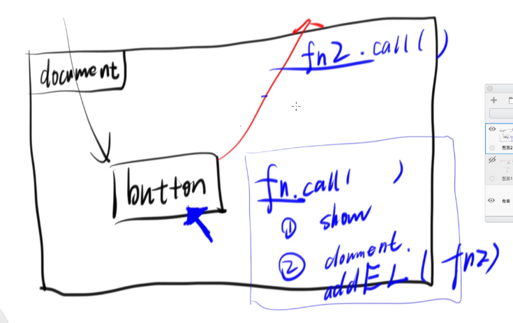 原因其实很简单, document 和 button 的两个函数都是在冒泡阶段执行的