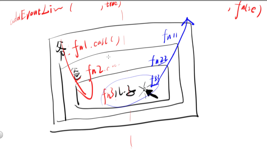 若三个 div 节点监听的事件均在冒泡阶段,那么对应函数执行的顺序就是 fn33 > fn22 > fn11;