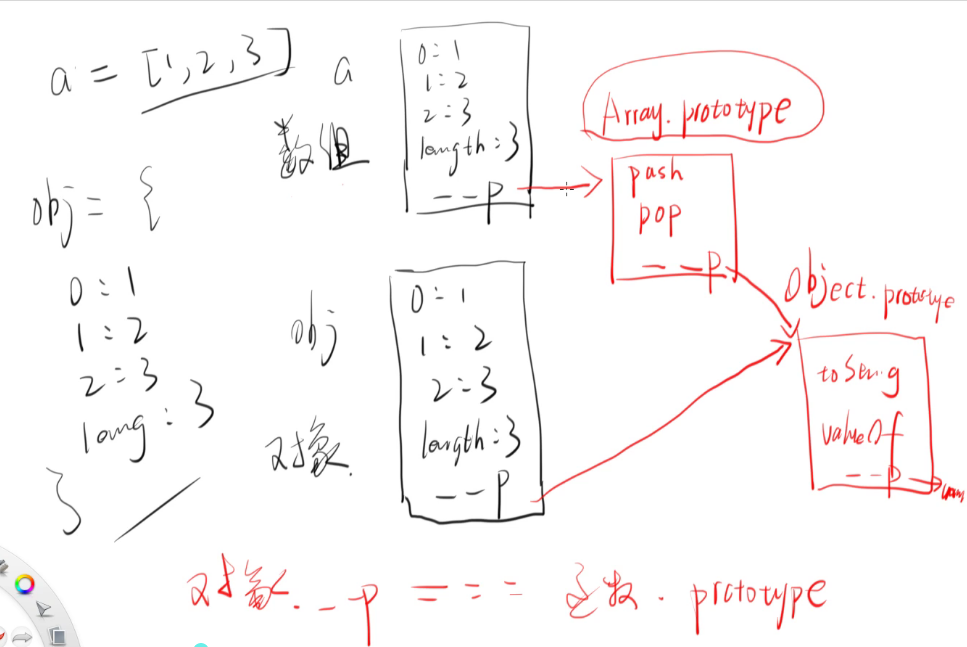 从上图中可以看到,本质上数组还是多了一个 Array.prototype 来指向最后的 Object.prototype,这个跟 obj 对象而言还是不一样的