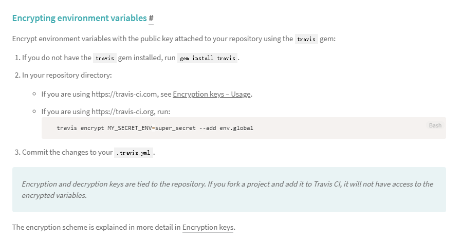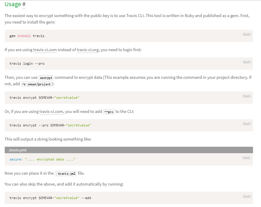 看了下,大致意思就是,你可以使用下面这条命令travis encrypt --pro SOMEVAR="secretvalue" --add
