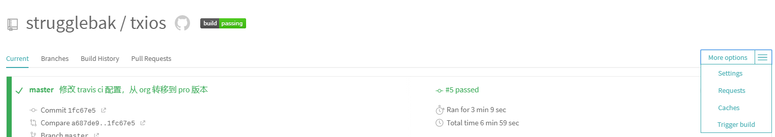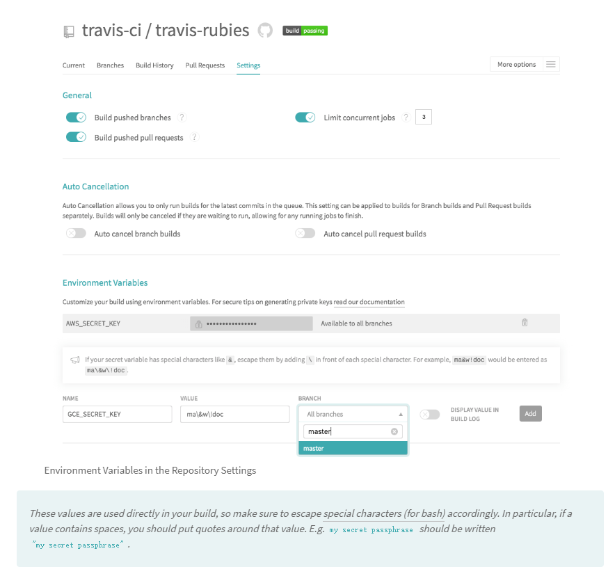 这就表示把你定义的变量加入到 travis 这个环境变量里面去了,然后你在 travis 上编译测试成功后,会在你项目你自己已经定义好的变量中去找,因为这是一个 key 和 value,找到你对应的 key 再解密然后比对 value,就达到了权限验证的目的了。