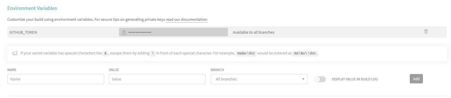 比如我的就是设置的变量名就是 GITHUB_TOKEN,就在 travis 项目中的 setting 页面中的那个 Environment Variables 里填,Value 项就是你在 github 上设置成功的 token 值,然后点击 Add 添加