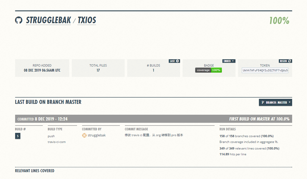 最后就是项目的修改和提交了,主要就是更改了 .travis.yml 配置文件,提交了之后等待 travis 测试通过,再刷新 Coveralls 官网对应的项目,看到下图表示代码覆盖率报告已经生成,也就是说可以在 shields.io 上拿到 coverage 的徽标了!