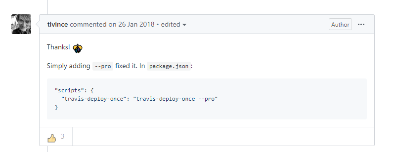 然后他是通过在 package.json 中的 travis-deploy-once 后加 --pro 解决的