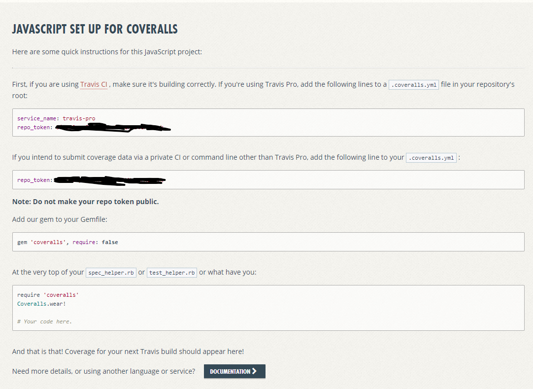 现在照着知乎那篇帖子配置了下, git push 后看结果,傻眼了,还是报那个错,而且刷新 Coveralls 的相关项目页的时候还是没有出现所谓的[代码覆盖率的报告],但是如果不生成这个报告的话,你就拿不到代码覆盖率的徽标了,继续搜索尝试解决问题