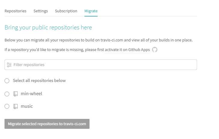 现在我懂了,如果你是从 travis-ci.org 那边过来的,那边如果有项目在的话,要在这个 travis-ci.com 用,必须要[迁移]过来。