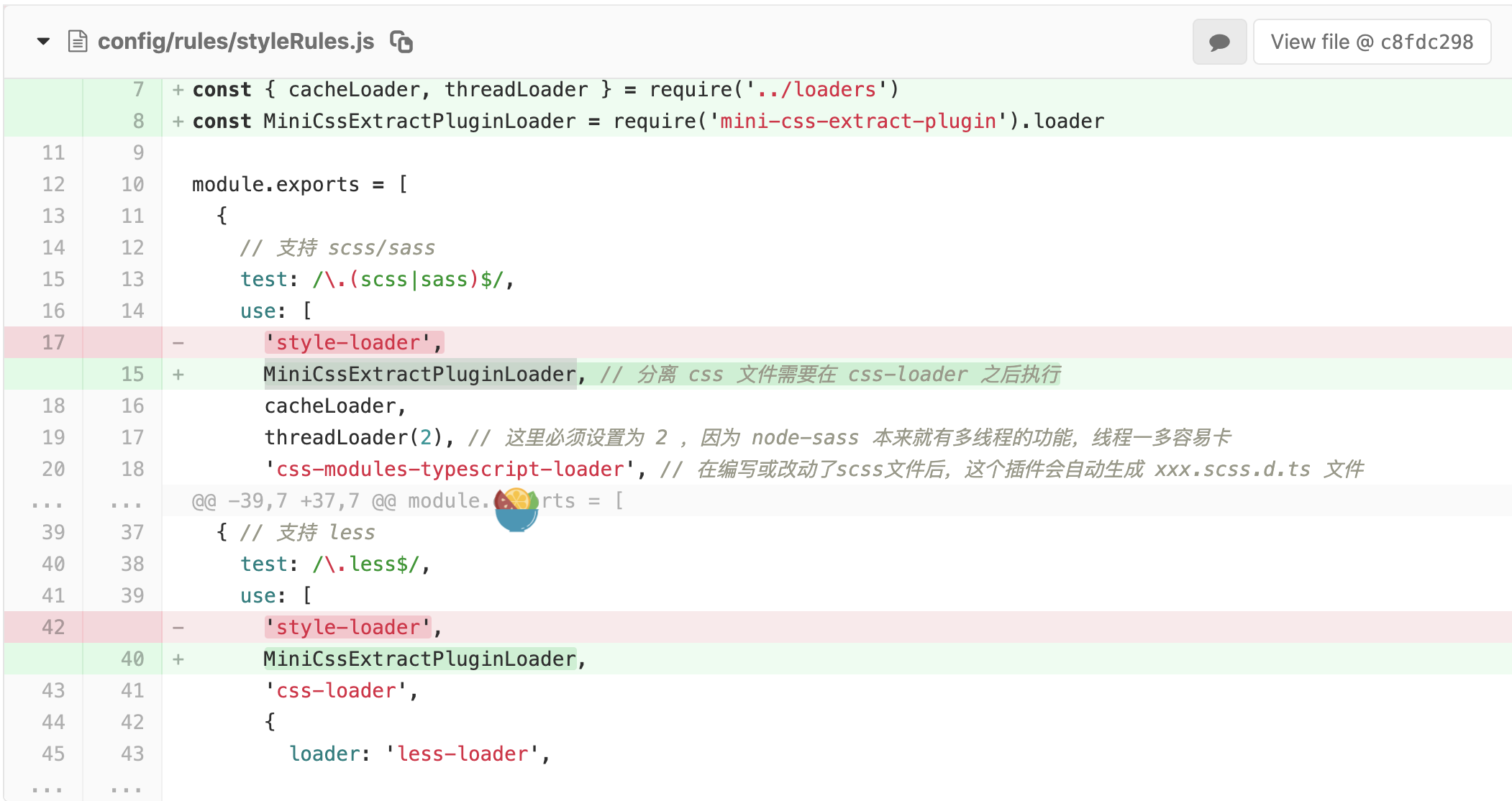 然后在 styleRules.js 中加上这个 MiniCssExtractPluginLoader(是的,本身这个插件是包含一个 loader 和一个 plugin 的)