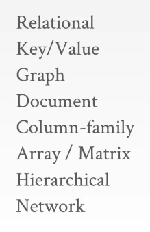 - Key/Value,Graph,Document, Column-family(NoSQL)