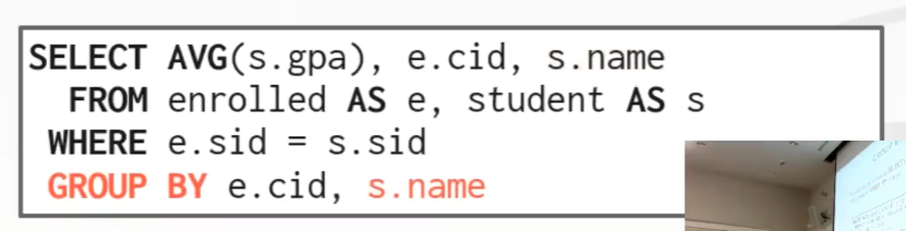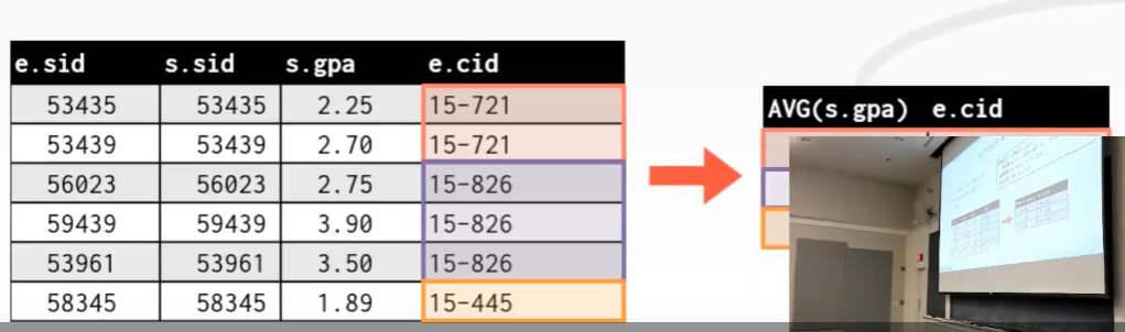 在这个内部查询(红色部分表示的)中,遍历整个 enrolled 表,对于每个 tuple,基于 cid 来对它们进行分组