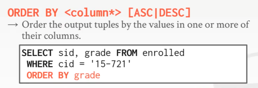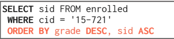 如果想要输出结果变得有序,使用 ORDER BY,因为 SQL 是基于 bag
