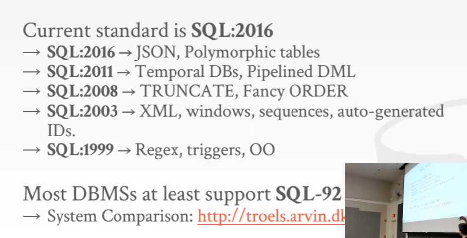 - 现在只有非常少的数据库系统通过 SQL:2016 标准
