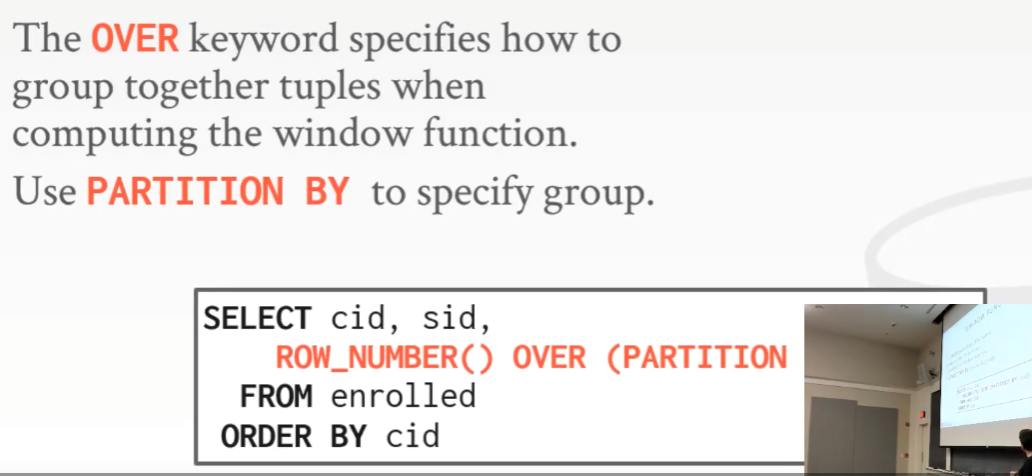 - OVER 关键字的作用是当计算 window 函数时,指定一种组合 tuple 的方式