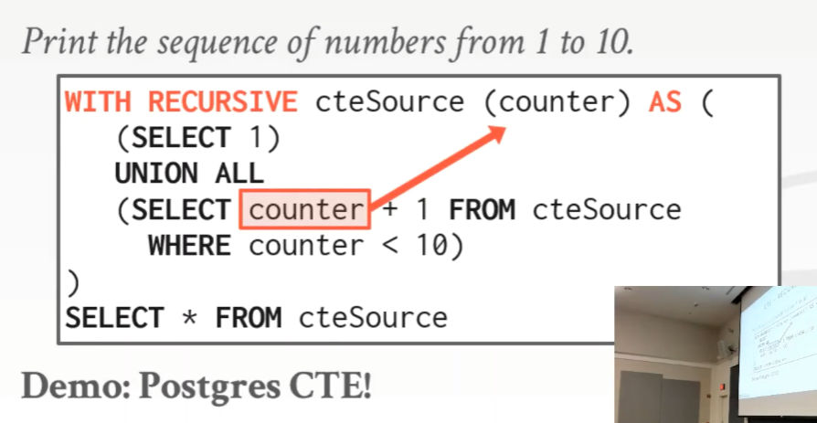在这个例子中,会生成只有一个属性的表(counter),调用一个 SELECT 来获取这个 tuple,然后对它进行 +1,这样就生成了一个新的 tuple。接着继续上述操作,直到 WHERE 条件无法匹配为止