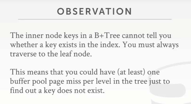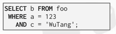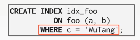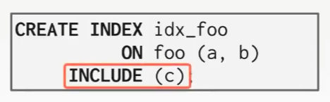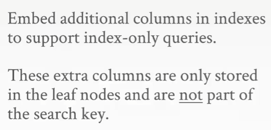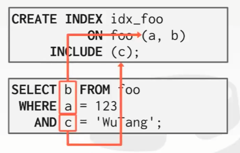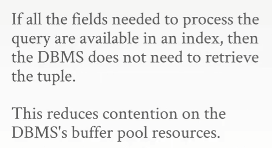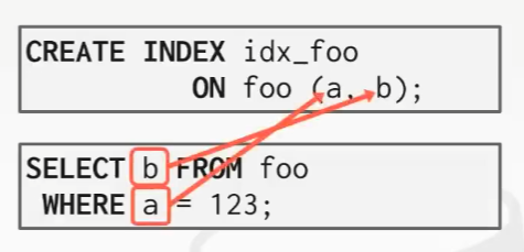 比如下面的查询,可以从这个索引中准确地找到 a 和 b 字段,也不需要去看实际的 tuple 是什么样的(可以直接越过查询 tuple,因为索引已经给出来了?注意这里要找的 tuple 都是放在表堆 table heap 里面的,它们并不是叶子节点,叶子节点都是索引。找 tuple 的过程是指,通过 B+ Tree 拿到 page ID 和 offset,然后到 Buffer 池中找到这个 page 对应的 tuple)