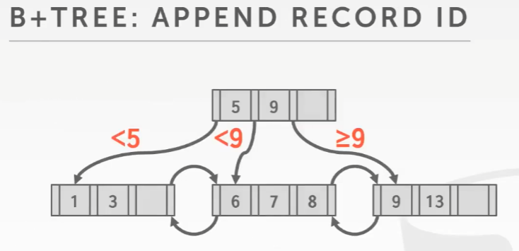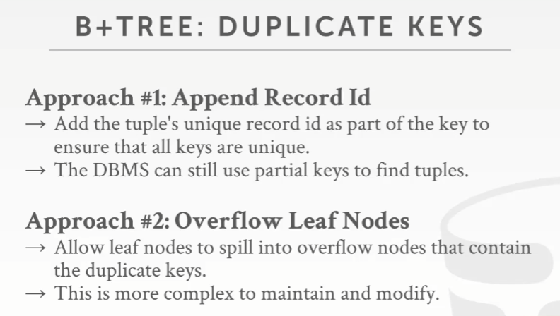 将重复的 key 保存在 overflow 的叶子节点上,但这种方式是违反 B+ Tree 设计规则的。这里并不是将叶子节点进行水平扩展去容纳新的 entry,而是将叶子节点进行垂直拓展,在给定的叶子节点下面添加这些 overflow page ,即跟之前讨论的 chained hash 表差不多的思路