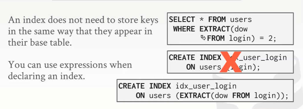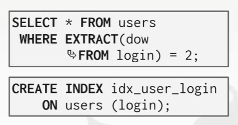 而这样创建索引是不对的,因为创建索引时没给出条件,即 users(login) 中,哪些条件是符合 dow From login 为星期二的 tuple 的,没给出条件就会为所有的这些 tuple 创建索引