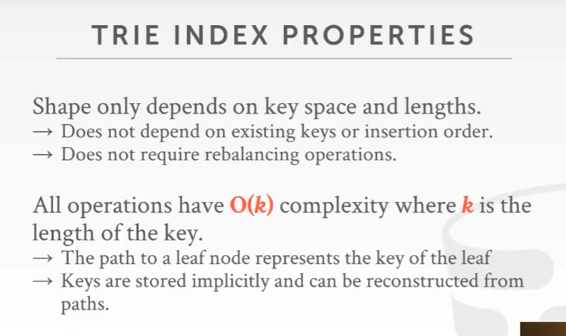 对于点查询来讲,Trie 的速度要比 B+ Tree 快的多,但如果是扫描,那么就相反,因为 Tire 需要通过回溯来进行查找