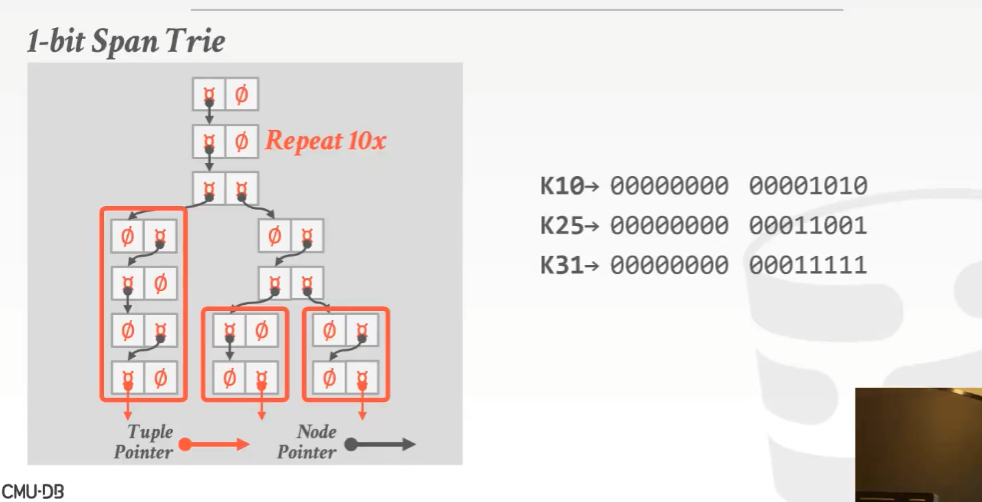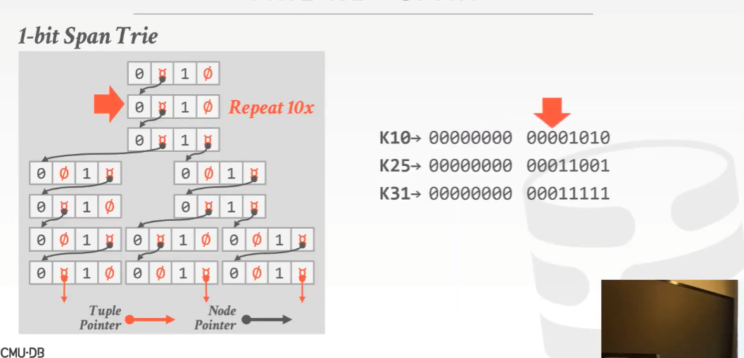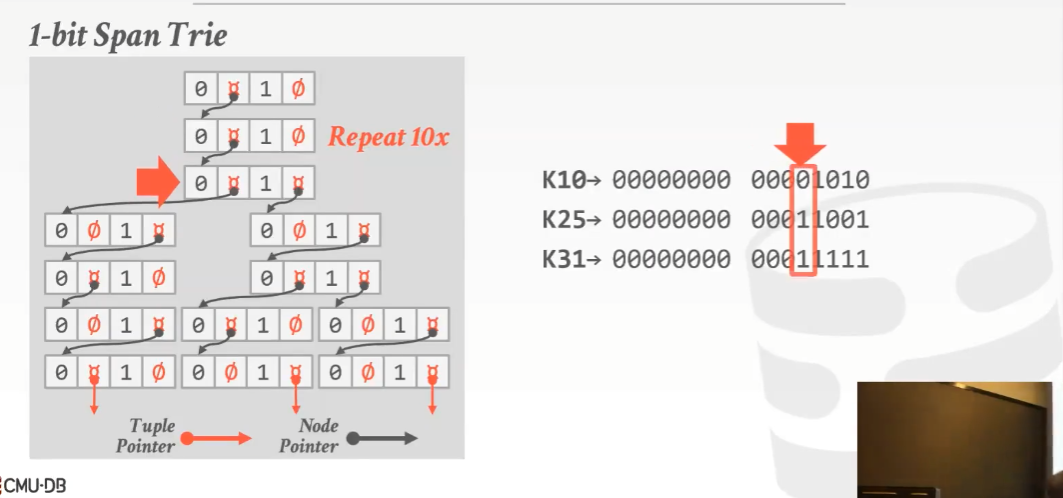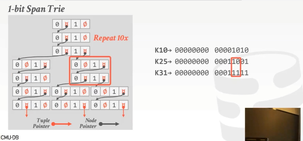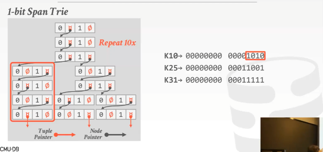 现在来看上图中 K10 的剩余部分,走的路线就是 1010,走到尽头就是一个 record ID,它指向了对应的 tuple