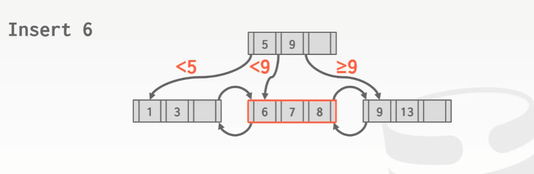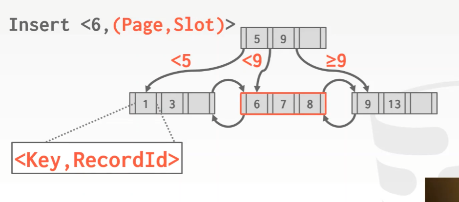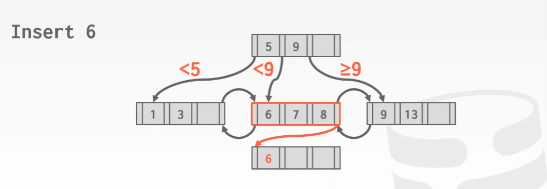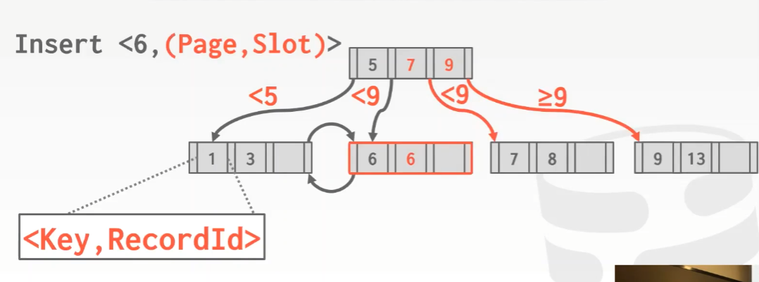 注意,数据库系统实际所保存的是 key 和 record ID 这样的组合,所以这里 insert 6 先做的是前缀搜索