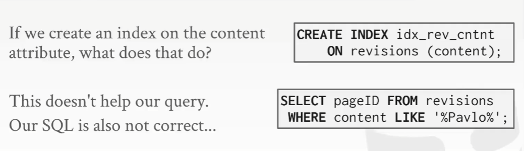 如果试着在 content 这个字段上构建索引,会是一个 bad idea,因为它会尝试使用表中这个属性里的 整个内容,来构建出 B+ Tree,然后有些 content 的 size 是按照 KB 来算的
