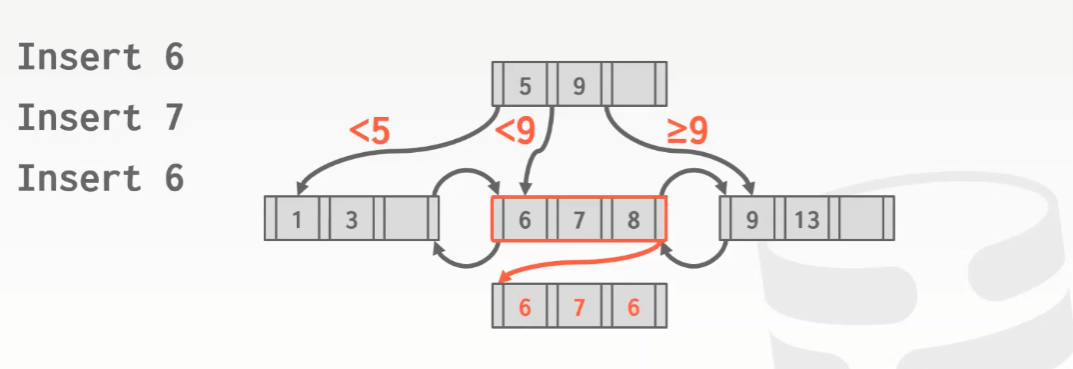 现在不需要对那个叶子节点做拆分,而是在这个节点上加一个 overflow page,然后把 6 插入到这个 overflow page 上,该叶子节点只需要有一个指针指向这个 overflow page 即可