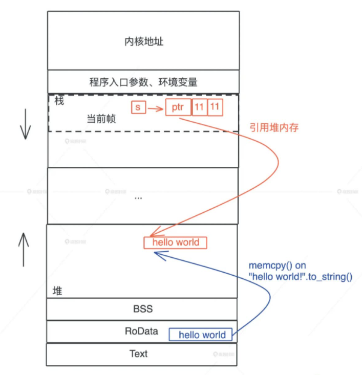 当执行 "hello world" .to_string() 时,在堆上,一块新的内存被分配出来,并把 “hello world” 逐个字节拷贝过去