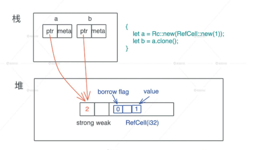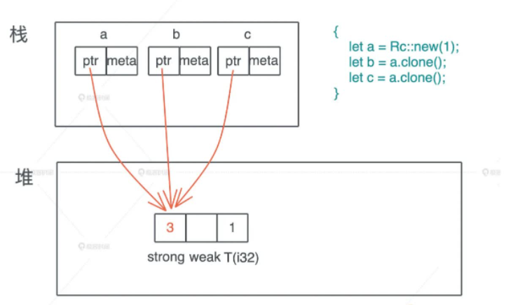 那么对于上面说的 堆上某个数据存在多个引用怎么办 的问题,Rust 解决如下图所示
