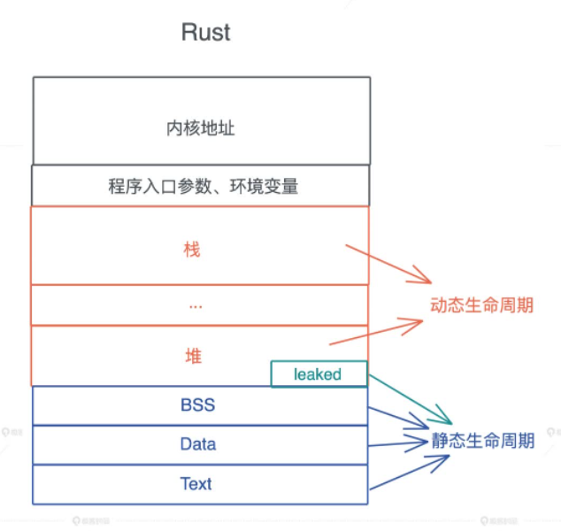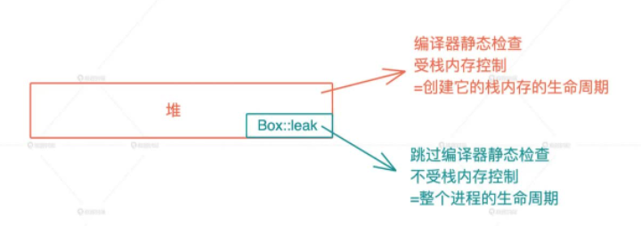 对于 Rust 而言,它是这么看待堆内存的生命周期的,即 大部分堆内存的需求在于动态大小,小部分需求是更长的生命周期,所以它默认将堆内存的生命周期和使用它的栈内存的生命周期绑在一起,并留了个小口子 Box::leak() 机制,让堆内存在需要的时候,可以有超出栈内存存活期的生命周期