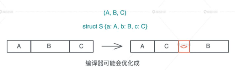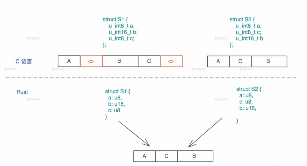 对于 struct 而言,Rust 在内存中排布数据时,会根据每个域的 对齐(aligment) 对数据进行重排,使其 内存大小 和 访问效率 最好