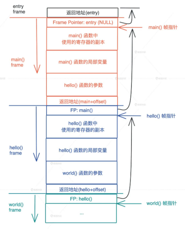 在调用的过程中,一个新的帧会分配足够的空间存储寄存器的上下文