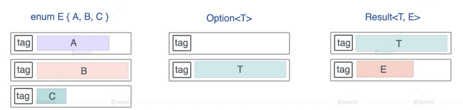 下图展示了 enum、 Option<T> 以及 Result<T, E> 的布局