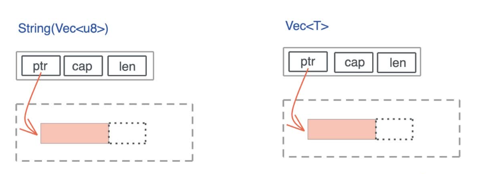 之所以 Vec<T> 和 String 要放在一起讲,是因为在 Rust 源码中,String 结构内部就是一个 Vec<u8>