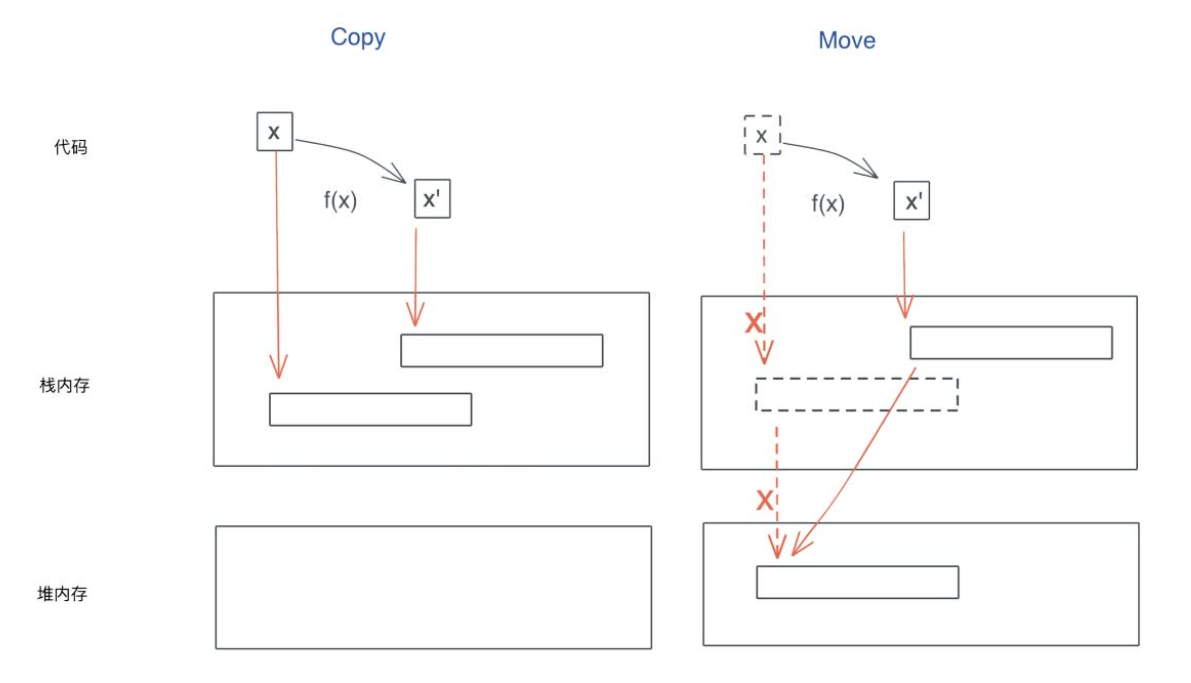 值的使用大部分都是 Copy 或者 Move,而 Copy 和 Move 在内部实现上,都是浅层的按位做内存复制,只不过 Copy 允许你访问之前的变量,而 Move 不允许