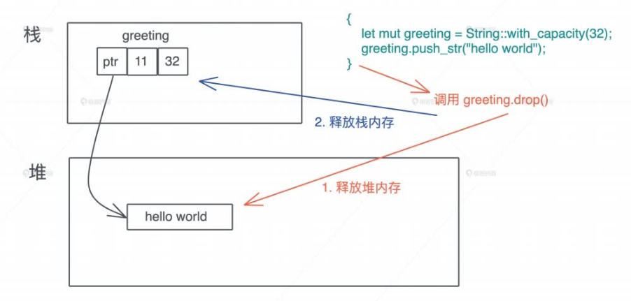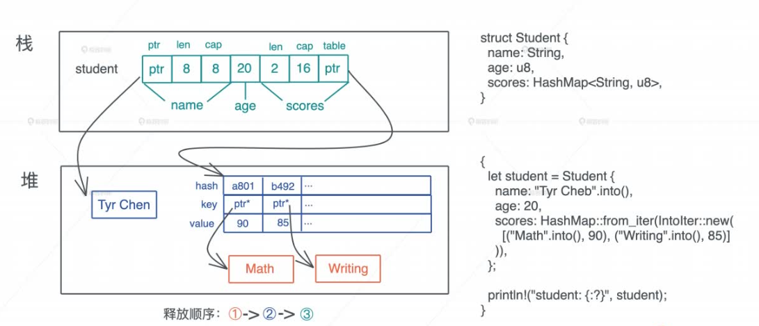 如果要释放的值是一个复杂的数据结构,比如一个结构体,那么这个结构体在调用 drop() 时,会依次调用每一个域(field)的 drop() 函数,如果这个域(field) 也是一个结构体,那么就 递归调用它对应的 drop() 函数