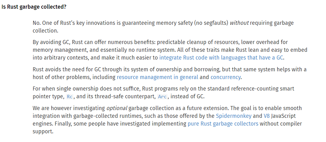 在之前的 Rust 官方的 FAQ 页面中,(为什么是 prev,因为现在 Rust 官方网站翻新了,这个属于旧页面)有这么一段