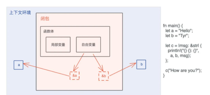 而闭包是将函数,或者说代码和其环境一起存储的一种数据结构。闭包引用的上下文中的自由变量,会被捕获到闭包的结构中,成为闭包类型的一部分