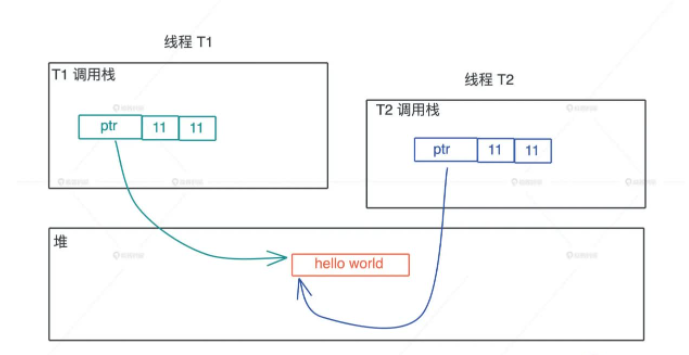 动态生命周期的内存也需要分配到堆上,因为从堆上分配出来的每一块内存需要显式的释放,这使得不同的调用栈之间可以共享数据,如图所示