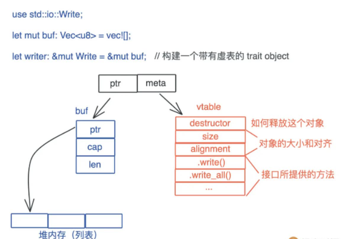下图展示了一个 Vec 数据在运行期被抹去类型,生成一个指向 Write 接口引用的过程: