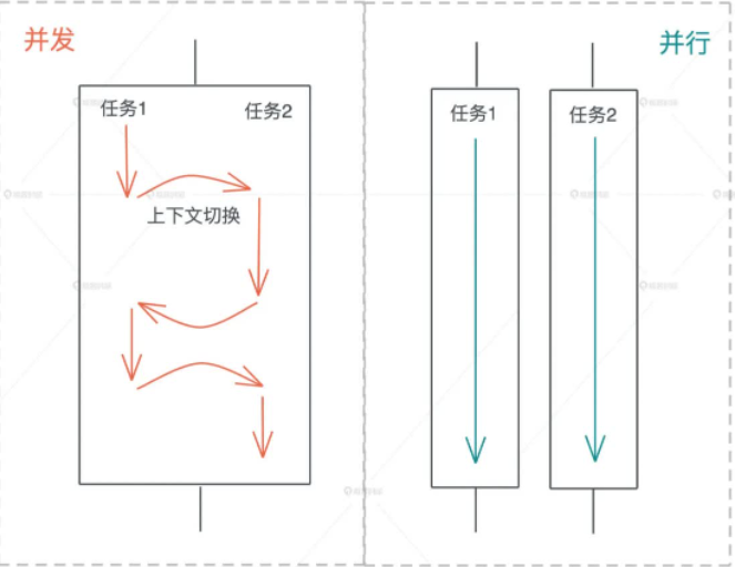 并发是同时与多件事情打交道的能力。比如系统可以在任务 1 做到一定程度后,保存该任务的上下文,挂起并切换到任务 2,然后过段时间再切换回任务 1。