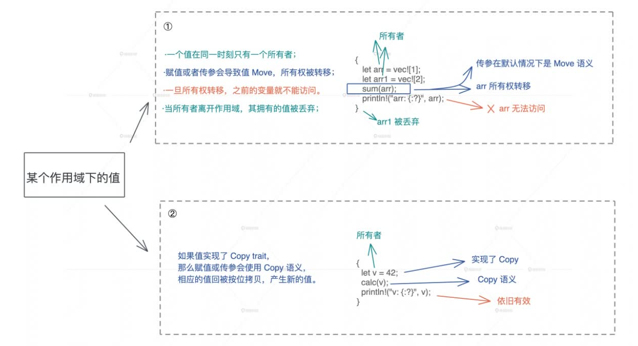 Move 语义是指,赋值或者传参会导致值 Move,所有权被转移,一旦所有权转移,之前的变量就不能访问